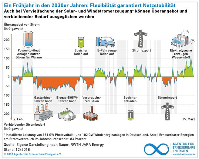 Wenn die Erzeugung aus Wind- und Sonnenenergie für die Deckung der Stromnachfrage nicht ausreicht, müssen heute und in Zukunft steuerbare Kraftwerke einspringen oder verschiebbare Lasten abgeschaltet werden. Umgekehrt gilt es, den Strom aus Wind und Sonne in Überschusssituationen möglichst sinnvoll zu nutzen. Das dynamische Zusammenspiel von Erneuerbaren Energien, Verbraucher*innen, Speichern und Netzen, die sich gegenseitig ergänzen, sorgt für eine stabile und verlässliche Versorgung. Das gilt vor allem dann, wenn die Sonne nicht scheint und gleichzeitig der Wind nicht weht, wie das Hintergrundpapier erläutert.