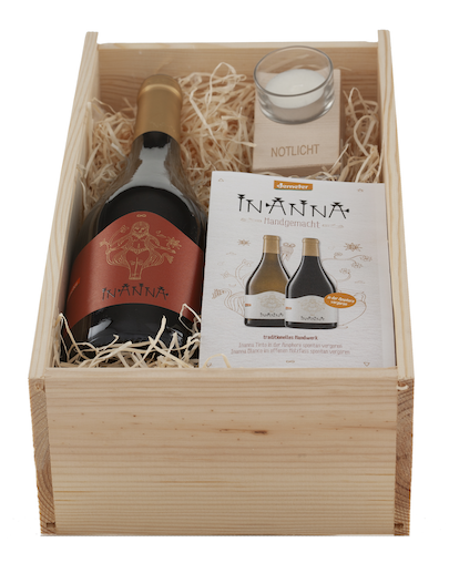 Verschenken Sie einen romantischen Weinabend samt Kerzenschein! Inanna Tinto – eine inspirierende Rotwein-Cuvée aus Spanien: 100 Prozent Bio, Demeter-zertifiziert, aus den Trauben alter Tempranillo-Reben, von Hand gelesen und in der Amphore vergoren. Die Weinbereitung erfolgt rein mechanisch, ohne Einsatz von elektrischer Energie. Zusammen mit einem nachhaltig produzierten „Notlicht" aus heimischem Ahornholz,
