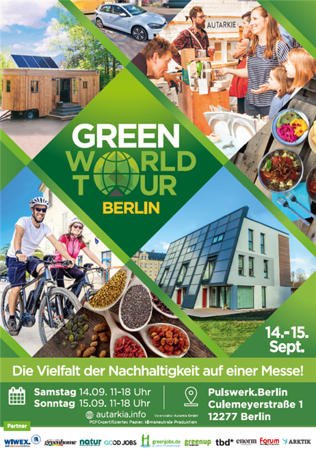 Die Green World Tour Messe öffnet am 14. und 15. September zum dritten Mal in Berlin ihre Tore. „Wir stellen die Vielfalt der Nachhaltigkeit vor", beschreibt Michael Lülf vom Veranstalter Autarkia GmbH das Messekonzept. Aufgeteilt in die Messebereiche Technologie & Wissenschaft, Lifestyle & Konsum, Studium & Karriere sowie nachhaltige Banken & Versicherungen werden im Pulswerk.Berlin mehr als 1.000 innovative Produkte und Inspirationen für ein nachhaltiges Leben präsentiert. Die Produkte und Dienstleistungen der Aussteller zeigen den Messebesuchern konkrete Anwendungsmöglichkeiten von mehr Nachhaltigkeit im Alltag auf.