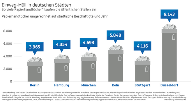 In Berlin sind es 436 Millionen, in Hamburg 327 Millionen und in München immerhin noch 180 Millionen Papierhandtücher: Jährlich bestellt die öffentliche Hand große Mengen Papierhandtücher, um die Waschräume der städtischen Ämter, Kitas und Unternehmen zu beliefern. Für die Städte Berlin, Hamburg, München, Köln, Stuttgart und Düsseldorf hat Dyson Zahlen erhoben und den Papierverbrauch miteinander verglichen.