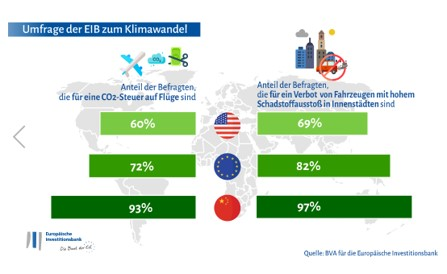 Die Europäische Investitionsbank (EIB) hat zusammen mit dem Marktforschungs- und Beratungsunternehmen BVA die zweite Ausgabe ihrer Umfrage zum Klimawandel durchgeführt. Sie will damit herausfinden, wie die Menschen in der Europäischen Union, in den USA und in China zum Klimawandel stehen. Generell befürworten die Menschen in Deutschland Maßnahmen für den Klimaschutz, auch wenn sie selbst davon betroffen sein könnten. In der Umfrage ging es um folgende Themen: