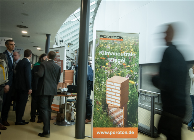 Sich selbst nicht nur ein Bild machen, sondern den klimaneutralen perlitverfüllten Ziegel auch anfassen konnten die Teilnehmerinnen und Teilnehmer am Infostand der Deutschen Poroton. Groß war das Interesse an der 3-Säulen-Strategie aus Erneuerung der Produktionslinie zur CO2-Einsparung, Nutzung von Energie aus erneuerbaren Ressourcen (Wind- und Wasserkraft) sowie der Kompensation von produzierten Emissionen durch die Unterstützung von Klimaschutz-Projekten.„Politikern und Fachpublikum konnte der über 7 000 Jahre alte Werkstoff Ziegel ins Bewusstsein gerufen werden. Als klimaneutrales Hightech-Produkt ist der Poroton-Ziegel wettbewerbs- und zukunftsfähig und bestens gerüstet für hohe Anforderungen an den Klimaschutz", so das Fazit Kuhlemanns.