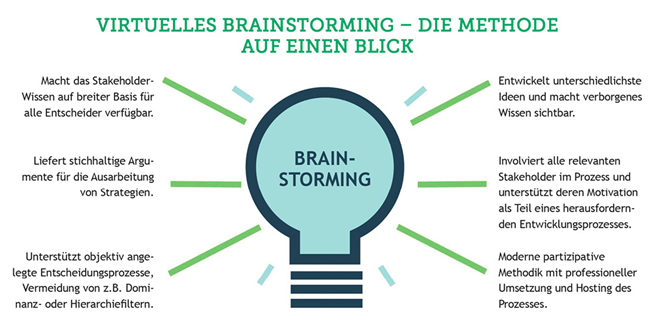 Jedes Unternehmen agiert und denkt zwangsläufig in einer Art Blase. Zukunftsfähige Strategien basieren jedoch auf dem Mut, diese Blase zu verlassen. Ran an den Speck heißt somit an das zu kommen, was in den Köpfen Ihrer Stakeholder schlummert. Und auch das zu berücksichtigen, was neu, anders und ungewohnt ist. Trotz komplexer Themen, unterschiedlicher Ansprüche und hoher Erwartungen muss ein Stakeholder-Dialog nicht schwierig sein. Was Sie dafür vor allem brauchen? Das passende Mindset – und eine fundierte Methode, mit der das Wesentliche gemeinsam auf den Punkt gebracht werden kann. Wollen und können Sie also mutig sein, gut zuhören, aktiv Dialoge führen, das Gemeinsame betonen, Vertrauen aufbauen und Ergebnisse offen kommunizieren? Dann ist Virtuelles Brainstorming die passende Methode für den nächsten Schritt.