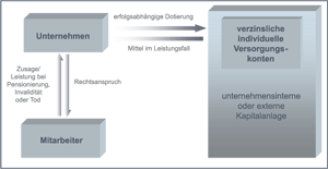 Der Arbeitgeber sagt den Mitarbeitern zu, alljährlich in Abhängigkeit vom jeweiligen Unternehmenserfolg einen gewissen Betrag für deren Altersversorgung zur Verfügung zu stellen. Diese Versorgungsbeiträge werden virtuellen mitarbeiterindividuellen Vorsorgekonten gut geschrieben, dort verzinst und im Versorgungsfall, sprich bei Pensionierung beziehungsweise vorheriger Invalidität oder Tod, in Form von Renten, Jahresraten oder einem Kapitalbetrag ausgezahlt. Der Clou dabei: Arbeits- und steuerrechtlich basiert dieser Ansatz auf dem Modell der Direktzusage, das heisst, der Arbeitgeber erteilt den Arbeitnehmern ein Versorgungsversprechen und ist im Versorgungsfall verpflichtet, die sich ergebenden Leistungen zu gewähren. Die Versorgungsbeiträge können dabei liquiditätsschonend unternehmensintern oder auch extern beispielsweise auf dem Kapitalmarkt oder auch in Rückdeckungsversicherungen angelegt werden. Die Verzinsung sollte sich natürlich nach der gewählten Anlageform richten.