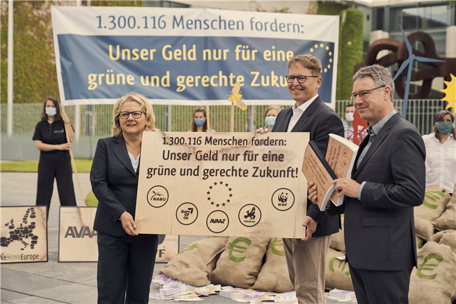 „Wir und mehr als eine Million Menschen fordern von der Bundesregierung, dass sie den sozial-ökologischen Umbau Europas in den Mittelpunkt der EU-Ratspräsidentschaft stellt. 1,3 Millionen Unterschriften! Der Auftrag ist deutlich: Die Hauptaufgabe für die Bundesregierung ist es, den Wiederaufbau der europäischen Wirtschaft auf Klima- und Umweltschutz auszurichten. Unser aller Wohlstand ist nur in einer intakten Umwelt möglich. Die milliardenschweren Investitionen des EU-Wiederaufbauprogramms geben den Weg für Jahrzehnte vor. Die Milliarden-Investitionen sind eine historische Chance, eine sozial-ökologisch nachhaltige Zukunft und ein krisenfestes Europa zu gestalten – mit klugen Investitionen in erneuerbare Energien, CO2-neutrale Mobilität, ökologische Landwirtschaft und den Schutz der biologischen Vielfalt. Die Bundesregierung hat in den nächsten Monaten die Aufgabe, die anderen EU-Staaten davon zu überzeugen."