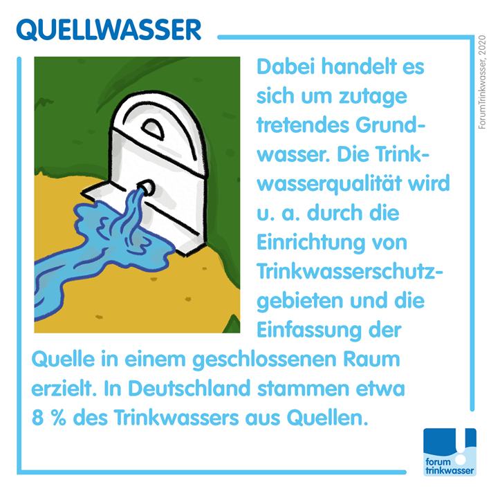 Trinkwasser aus Grundwasser stammt aus Tiefen von bis zu 200 Metern. Es stellt mit einem Anteil von 61 Prozent den größten Anteil unserer Trinkwasserversorgung dar. Niederschläge versickern im Boden und werden beim Durchfließen verschiedener Bodenschichten einerseits auf natürliche Weise gereinigt, andererseits mit Mineralien angereichert. Sandreiche Böden filtern am besten. Denn Sand ist grobporig und lässt neben dem durchsickernden Niederschlagswasser auch Luft in die Poren. Dies sind ideale Voraussetzungen dafür, dass winzige Mikroorganismen dabei helfen können, das Wasser ganz natürlich zu reinigen.Bei zutage tretendem Grundwasser handelt es sich um Quellwasser. Die Trinkwasserqualität wird u. a. durch die Einrichtung von Trinkwasserschutzgebieten und die Einfassung der Quelle in einem geschlossenen Raum gesichert. In Deutschland stammen etwa 8 Prozent des Trinkwassers aus Quellen. Für rund 31 Prozent der Wasserversorgung wird Oberflächenwasser verwendet. Hierfür eignen sich besonders Talsperren und Seen.