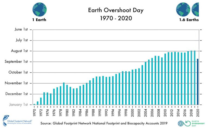 Das Global Footprint Network berechnet jedes Jahr den Tag, an dem die Erdüberlastung erreicht ist (Earth Overshoot Day). Dabei werden zwei rechnerische Größen gegenüber gestellt: zum einen die biologische Kapazität der Erde zum Aufbau von Ressourcen sowie zur Aufnahme von Müll und Emissionen, zum anderen der Bedarf an Wäldern, Flächen, Wasser, Ackerland und Fischgründen, den die Menschen derzeit für ihre Lebens- und Wirtschaftsweise verbrauchen. Um ihren Ressourcenbedarf nachhaltig zu decken, bräuchte die Weltbevölkerung rechnerisch 1,6 Planeten. Würden alle Länder so haushalten wie Deutschland, wären sogar drei Erden nötig (bezogen auf das Jahr 2019). Bei einer Lebensweise wie in China bräuchte die Weltbevölkerung 2,2 Erden; würden alle Menschen so wirtschaften wie in den USA bräuchten sie fünf Erden. Während der Erdüberlastungstag in den Siebzigerjahren wegen des geringeren Ressourcenverbrauchs noch in den Dezember fiel, lag er im vergangenen Jahr bereits auf dem 29. Juli.