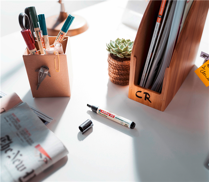 Die edding EcoLine umfasst verschiedene Marker für die Büroanwendung und erfüllt alle Anforderungen an nachhaltige Produkte: Die Kunststoffteile der zur Serie gehörenden Permanent-, Whiteboard- und Flipchartmarker bestehen zu 90 Prozent aus Recyclingmaterial, wovon 83 Prozent Post-Consumer-Kunststoffe sind, die z.B. aus alten Joghurtbechern gewonnen werden. Auch der edding 24 EcoLine Highlighter, ausgezeichnet mit dem Blauen Engel, überzeugt durch nachhaltige Eigenschaften: Kappe und Schaft werden zum überwiegenden Teil aus nachwachsenden Rohstoffen auf Zuckerrohrbasis gefertigt.