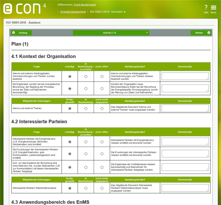 Der neue ISO-Assistent der econ4-Software leitet Unternehmen Schritt für Schritt durch den kompletten Zertifizierungsprozess. So können sich Nutzer jeden einzelnen Punkt der aktuellen ISO-Norm 50001 2018 einfach anzeigen lassen und sukzessive abarbeiten. Eine Übersicht zeigt sofort den aktuellen Bearbeitungsstatus. Ergänzende Beratungsdienstleistungen wie der neue „econ Kennzahlencheck" oder die „econ Effizienzbegleitung" runden den neuen ISO-Assistenten ab.