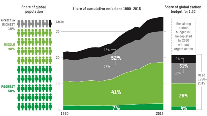 Der Bericht "Confronting Carbon Inequality" wertet aus, für wie viel CO2-Ausstoß die einzelnen Einkommensgruppen verantwortlich sind. Analysezeitraum sind die klimapolitisch wichtigen Jahre zwischen 1990 und 2015, in denen sich die klimaschädlichen Emissionen weltweit verdoppelt haben. Für diesen Anstieg sind insbesondere die reichsten 10 Prozent verantwortlich, nicht die globale Mittelklasse, wie häufig angenommen wird. Ungleichheit spielt für die Beschleunigung der Klimakrise eine entscheidende Rolle:- Die reichsten 10 Prozent (630 Millionen Menschen) sind für über die Hälfte (52 Prozent) der CO2-Emissionen verantwortlich, die zwischen 1990 und 2015 verbraucht wurden. Das reichste 1 Prozent verbrauchte alleine 15 Prozent, während die ärmere Hälfte der Menschheit nur für 7 Prozent verantwortlich war.