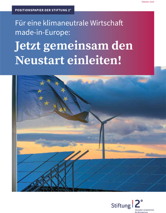 Die Europäische Union steht vor der historischen Aufgabe, die Wirtschaft aus einer beispiellosen Krise zu führen und gleichzeitig die Weichen für eine klimaneutrale Wirtschaft made-in Europe zu stellen. Der von EU-Kommissionspräsidentin Ursula von der Leyen vorgelegte EU Green Deal muss deshalb zu Europas Innovations- und Wachstumsstrategie werden. Er muss nun konkretisiert und mit politischen Instrumenten hinterlegt werden. Hierfür macht das Positionspapier konkrete Vorschläge. „Made climate neutral wird das neue Qualitätsmerkmal für Produkte, so wie früher made in Germany."