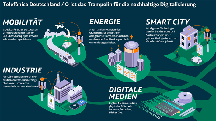 Europäische Studien zeigen, dass eine Volkswirtschaft mit der Erhöhung ihres Digitalisierungsgrades bis zu 1,9 Prozent mehr Wachstum pro Jahr erzielen kann. Auch die aktuelle Wirtschaftskrise in Folge des Corona-Virus zeigt, dass sich digitalisierte Unternehmen schneller an die neue Situation anpassen und besser durch die Krise kommen. So werden beispielsweise in der Industrieproduktion Maschinen mit Maschinen über den Mobilfunk vernetzt. Internet-of-Things-Lösungen und Sensorik optimieren Produktionsabläufe. Die vernetzten Maschinen arbeiten reibungslos miteinander und produzieren weniger Ausschuss. Eventuelle Störungen können frühzeitig durch vorausschauende Instandhaltung vermieden werden. Zudem können Maschinen in Leerzeiten automatisiert abgeschaltet und deren Lebensdauer kann verlängert werden. Das macht Unternehmen produktiver und gleichzeitig nachhaltiger. Denn optimale Produktionsabläufe schonen Ressourcen und bieten Potenzial zur Senkung der CO2-Emissionen.Jenseits der etablierten Industrieproduktion entwickeln Unternehmen neue digitale Produkte und Geschäftsmodelle, die den Wohlstand stärken und gleichzeitig der Verwirklichung von Nachhaltigkeitszielen dienen. Wayra, Telefónicas Startup Accelerator, fördert solche Unternehmen, wie etwa Fold AI. Das Unternehmen erfasst mit Sensorendaten in Wäldern, auf deren Grundlage beispielsweise Förster über ein Dashboard, diverse Apps, und eine 5G-Übertragung den Zustand ihrer Bäume in Echtzeit erfassen. Mögliche Bedrohungen werden schon in der Entstehung erkannt und es kann ihnen entgegengewirkt werden. Die digitale Infrastruktur von Telefónica Deutschland / O2 und insbesondere der neue 5G-Standard sind das Trampolin, auf dem Unternehmen und Menschen derartige nachhaltige Anwendungen und Geschäftsmodelle verwirklichen.