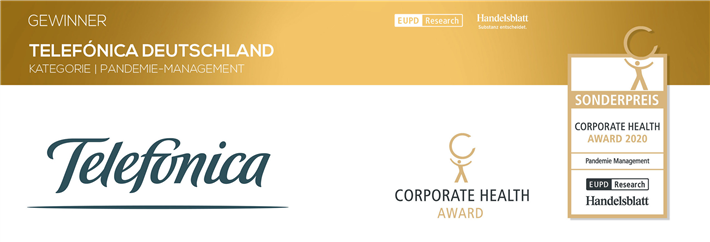 Telefónica Deutschland hat sich als Arbeitgeber auch 2020 wieder in vorbildlicher Weise für die Gesundheit und das Wohlbefinden seiner Mitarbeiterinnen und Mitarbeiter eingesetzt. Das bestätigt jetzt auch das Ergebnis des Corporate Health Award, eine der renommiertesten Auszeichnungen für das betriebliche Gesundheitsmanagement in Deutschland. Das Unternehmen hat in diesem Jahr nicht nur erneut das Exzellenz-Siegel erhalten, sondern zugleich auch den Sonderpreis Pandemie-Management gewonnen.