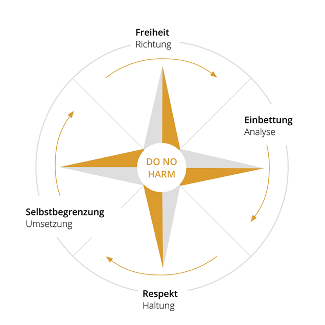 Der ethische Kompass wurde im Reformationsjahr 2017 am Wittenberg-Zentrum für Globale Ethik im Diskurs mit Führungskräften, Wissenschaftlern, Studierenden und anderen Gesprächspartnern erarbeitet. Er kann verstanden werden als Orientierung für die Erarbeitung eines individuellen moralischen Kompasses, sei es für eine Person, sei es für korporative Akteure wie Unternehmen. Im Zentrum des Kompasses steht eben jenes Prinzip, von dem schon die Rede war: das Gebot der Nichtschädigung. Dieses Gebot ist die vermutlich allgemeinste ethische Orientierung in der Menschheitsgeschichte und basiert auf einer elementaren Eigenschaft jedes Menschen: seiner Verletzlichkeit, die unter anderem das Thema Vertrauen so wichtig werden lässt – als Erwartung, dass die eigene Verletzlichkeit nicht von anderen ausgenutzt wird.
