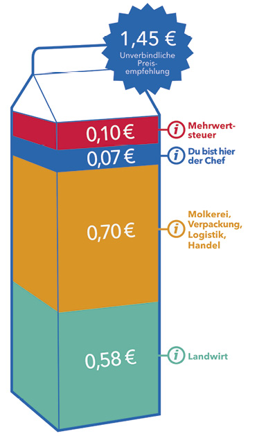 Die unverbindliche Preisempfehlung liegt bei 1,45 Euro pro Liter. Landwirte bekommen eine faire Vergütung von 0,58 Euro pro Liter (+0,11 €/Liter im Vergleich zum Bundesdurchschnitt für Bio-Milch). „Die neue Marke ist eine Chance, die Verbraucher*innen tatsächlich mitzunehmen. Wir produzieren genau nach ihren Wünschen und sie können sich mit unserer Milch identifizieren. Und natürlich ist es auch nicht unerheblich, dass wir einen fairen Auszahlungspreis garantiert bekommen", sagt Sven Lorenz, Landwirt aus Vöhl und Vorsitzender der Milcherzeugergemeinschaft Hessen, deren Betriebe die Verbraucher-Milch produzieren.