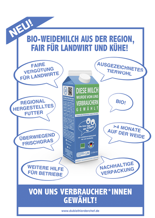 Auf der Internetplattform www.dubisthierderchef.de wählen die Verbraucher*innen ein Produkt aus, beantworten den entsprechenden Fragebogen, entscheiden über relevante Produktmerkmale wie Herkunft, Produktionsprozess, Vergütung für die Landwirte, Qualität und Verpackung und bestimmen den Verkaufspreis mit. Jedes der gewählten Merkmale erhöht den Preis. „Alle Antworten werden dann ausgewertet und in einem Pflichtenheft zusammengefasst", erklärt der Betriebswirt Barthelmé weiter. „Die Verbraucher*innen schaffen sich ihr Lieblingsprodukt gewissermaßen selbst, und damit es dann auch den Weg in die Supermarktregale findet, suchen wir parallel Landwirte, Hersteller und Händler als Partner." Milch war – wie in Frankreich – das erste Produkt, das auf diese Weise im Markt eingeführt wurde. In Kürze sollen Eier, Kartoffeln und Butter folgen. Über die Wichtigkeit in der Reihenfolge haben ebenfalls die Verbraucher*innen bereits abgestimmt. In Kürze werden die Online-Formulare für die Abstimmung der nächsten Produkt-Designs veröffentlicht. Auf diese Weise sollen alle wichtigen Lebensmittel nach und nach in die neue Marke integriert werden.Die Teilnahme am Voting ist für Verbraucher*innen kostenlos. Zudem können besonders engagierte Verbraucher*innen mit einer einmaligen Aufnahmegebühr von einem Euro ab sofort Vereinsmitglied werden und die Entwicklung der Initiative mitgestalten. „Uns ist es wichtig, dass unsere Mitglieder an allen wichtigen Entscheidungen der Initiative teilhaben, diese bei der Kommunikation beziehungsweise bei Events unterstützen oder die Partner besuchen, um zum Beispiel die Einhaltung der von der Community gewählten Pflichtenhefte vor Ort zu kontrollieren", erklärt der Gründer der Initiative. Mundpropaganda und Social Media sollen herkömmliche Werbung ersetzen und so zu attraktiven Preisen beitragen.