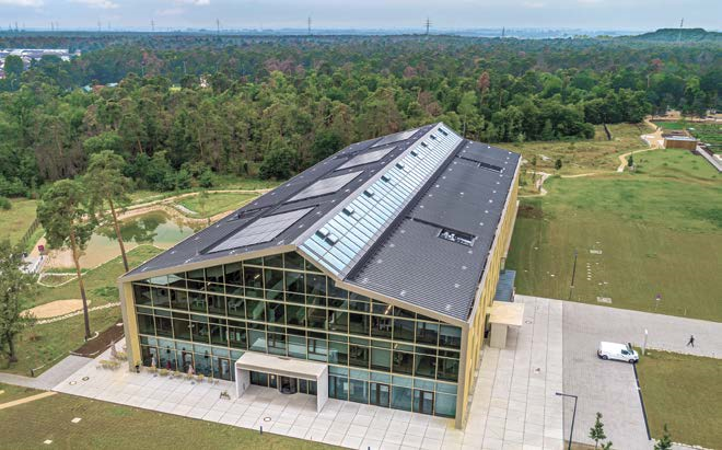 Atriums. 25 Prozent des Strombedarfs deckt eine Photovoltaikanlage auf dem Dach. Der Rest wird über