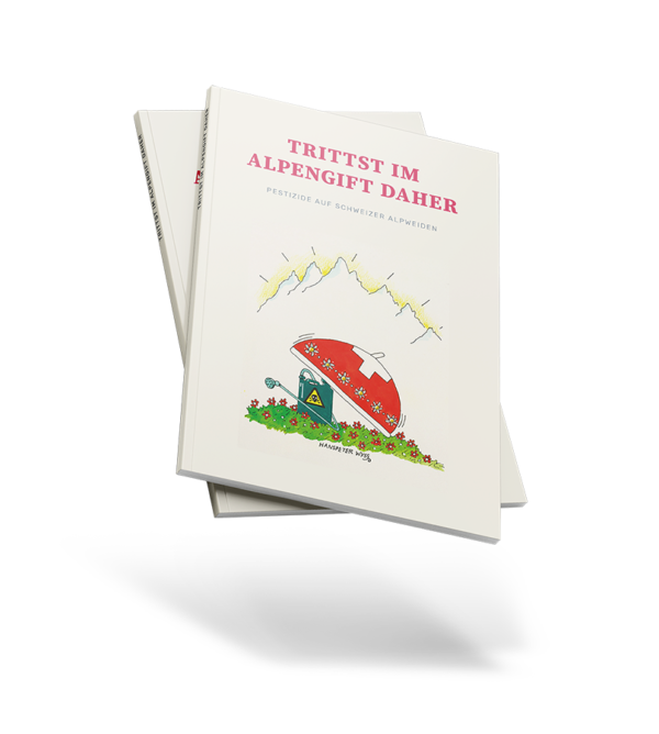 "Trittst im Alpengift daher" heisst das 52-seitige Booklet über Herbizideinsätze auf unseren Alpen. Herausgeberin ist die Bio-Stiftung Schweiz. Der Autor Peter Jaeggi sowie zehn prominente Schweizer Cartoonschaffende lenken den Blick auf das giftige Tun, das sich fast unbemerkt auf mancher Schweizer Alp abspielt. Herbizide werden auf Alpweiden gegen unerwünschte Pflanzen eingesetzt. Unnötig, denn es geht auch ohne Gift, wie diese Recherche zeigt.