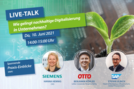 Siemens, SAP und Otto über nachhaltige Digitalisierung Firmenvertreter*innen sprechen im digitalen Live-Talk am 10.6. über Chancen und Risiken der Digitalisierung für Mensch und Umwelt |