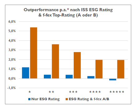 Je nachhaltiger ein Fonds ohne Fondsrating ist, desto weniger Rendite erzielt er allerdings unter Umständen im Schnitt: 5-Sterne ISS-ESG Fonds schnitten auf Sicht von fünf Jahren mit -0,2 Prozent Outperformance ab, während nachhaltige Fonds mit fünf Sternen und f-fex Finanzrating 1,9 Prozent Outperformance erzielten.