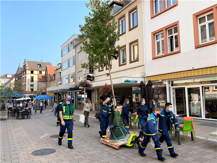 Denn beherztes Zupacken war gerade bei einer der spektakulärsten Aktionen in der Stadt gefordert. Sechs sogenannte Wanderbäume sollten leere Plätze begrünen und dort Schatten spenden. Die ziemlich hoch aufgeschossenen junge Bäume mussten gegen Regen und Sturm gesichert werden, weil ihre Wurzeln in verpackten Ballen statt im Erdreich steckten. „Zweibrücken vernetzt" schickte Leute zum Sichern und Verzurren.