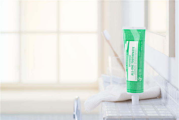 Nachhaltig inklusive der Verpackung: Dr. Bronner's All-One Zahnpasta ist in Tuben aus hochdichtem Polyethylen (HDPE) verpackt, das zu 33 Prozent aus biobasiertem Kunststoff aus Zuckerrohr besteht, einer nachhaltigeren Alternative zu erdölbasierten Kunststoffen. Die gesamte Verpackung, einschließlich Tube, Verschluss und Schachtel, ist so konzipiert, dass sie vollständig recycelbar ist. Die Schachteln, die zur Verpackung verwendet werden, bestehen aus 100 Prozent Recyclingpapier mit einem Mindestanteil von 35 Prozent Post-Consumer-Recycling (PCR) Fasern. Die verbleibenden 65 Prozent der in diesen Schachteln verwendeten Fasern sind post-industriell recyceltes (PIR) Material. Zudem hat das Unternehmen sich vor Kurzem auch dafür entschieden, den zusätzlichen Originalitätsschutz (z.B. Silberfolie) wegzulassen.
