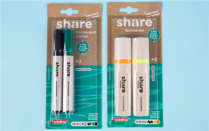 Die Marker der edding EcoLine, die in Deutschland produziert werden, bestehen zum überwiegenden Teil aus nachwachsenden Rohstoffen bzw. aus Post-Consumer-Recyclingmaterial, sind nachfüllbar und klimaneutral gemäß ClimatePartner-ID 13742-1910-1001.„Wir freuen uns sehr über diese Kooperation, denn share ist ein Partner, der in vollem Umfang zu unseren Werten passt. Soziales Engagement und Nachhaltigkeit haben bei share oberste Priorität und werden in beeindruckender Weise umgesetzt. Faires und nachhaltiges Handeln ist auch bei edding von Anbeginn fest in der Unternehmenskultur verankert und wird von der Beschaffung bis zum Vertrieb konsequent gelebt. Gemeinsam möchten wir mit unseren Produkten das Leben möglichst vieler Menschen ein Stück weit besser machen", kommentiert Per Ledermann, CEO der edding AG.