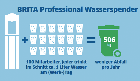 - Weniger Abfall. Diese Zahl muss man sich auf der Zunge zergehen lassen: Sage und schreibe über 500 kg Abfall pro Jahr spart sich ein Betrieb mit 100 Mitarbeitern, wenn Wasser aus dem eigenen Hahn statt Flaschenwasser getrunken wird. Dabei gehen wir von einem Liter Wasser pro Person und Werktag aus.