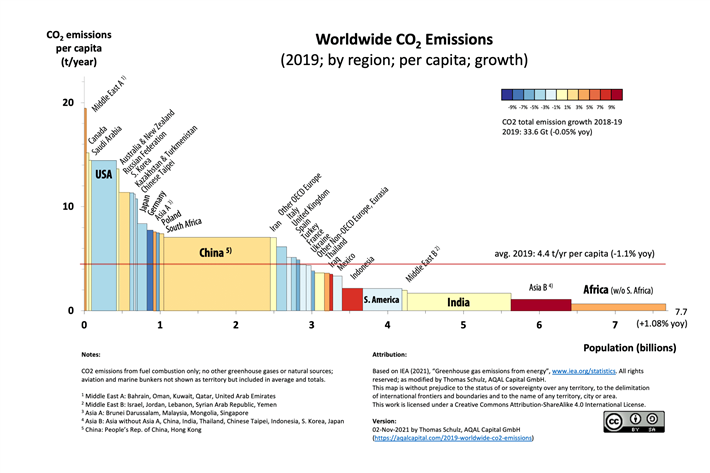 Die USA und Kanada emittieren 2-3 Mal (~14-15 t/Jahr) mehr pro Kopf als Europa (~4,4-7,8 t/Jahr). China liegt mit 7,1 t/Jahr weit über dem Weltdurchschnitt von 4,4 t/Jahr und hat in Bezug auf die CO2-Emissionen den Status eines entwickelten Landes erreicht. Aufgrund seiner großen Bevölkerung (1,4 Milliarden) und der fortschreitenden Industrialisierung ist China zu einem bedeutenden Emittenten von CO2-Emissionen geworden. Dies ist zum Teil darauf zurückzuführen, dass mehrere andere Länder ihre CO2-Emissionen häufig nach China "exportiert" haben, indem sie chinesische Waren importiert haben. Das übrige Asien, insbesondere Indien, und Afrika liegen weit unter dem Weltdurchschnitt, holen aber wirtschaftlich und damit auch bei den CO2-Emissionen auf. Viele dieser Länder haben sowohl ihre Bevölkerung als auch ihre Pro-Kopf-Emissionen erhöht.