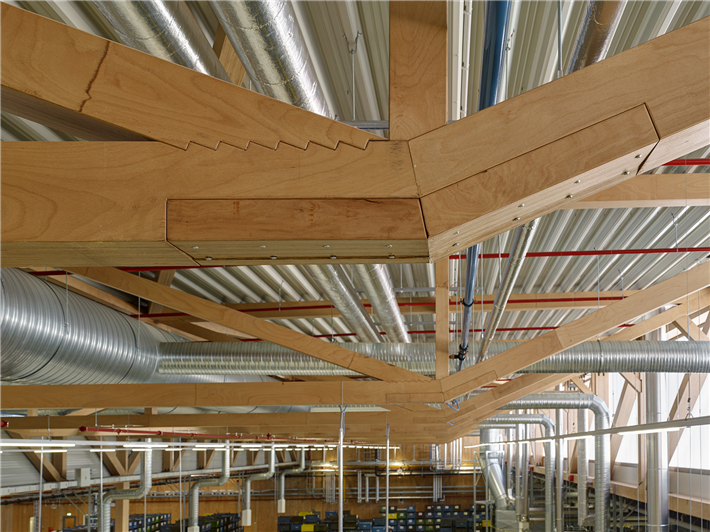 Entsprechend ist Furnierschichtholz aus Buche derzeit auf dem Vormarsch und bereits in vielen Bauprojekten zu finden, vor allem als Tragwerk von Gewerbehallen, aber auch innerhalb mehrgeschossiger Wohnbauten. Als Beispiel sei eine 2019 errichtete Produktionshalle für ein Schraubenwerk im baden-württembergischen Waldenburg genannt (s. Foto). Für die geplante Abmessung von 97 auf 114 Meter, die aus Gründen der Produktionsflexibilität weitgehend stützenfrei sein sollte, schieden klassische Holzbaustoffe wie Nadelholz oder gängige Brettschichthölzer aus. Die Wahl fiel auf Buchen-Furnierschichtholz, das auf Grund seines hohen Tragverhaltens eine vergleichbare, aber deutlich klimaschädlichere Stahlkonstruktion ersetzen konnte.