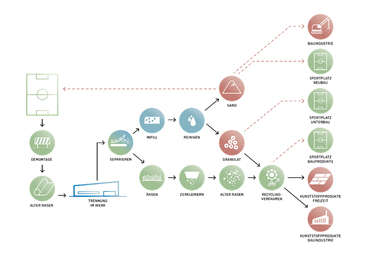 Normalerweise hat ein Kunstrasenfeld eine Lebensdauer zwischen zwölf und 15 Jahren. Danach stellt sich die Frage, wohin mit dem alten Belag: Bisher wurde der Rasen deponiert oder thermisch verwertet. Das entspricht zwar auch heute noch den gesetzlichen Vorgaben, ist aber nicht besonders nachhaltig. Bei FormaTurf geht man jetzt einen anderen Weg, den der stofflichen Verwertung: Der Rasen wird ausgebaut, die einzelnen Bestandteile in einem Nasstrennverfahren separiert und wiederverwertet. Aus den Kunststoffen entstehen neue Produkte, die zum Beispiel beim Sportplatzbau wieder eingesetzt werden können. Das können Bausteine, Rasengittersteine oder Kantsteine sein. Der Sand, der bis zu 70 Prozent Gewichtsanteil bei einem Kunstrasensystem hat, wird gewaschen und kann zum Beispiel wieder als Infill oder zu anderen Zwecken hergenommen werden. Die Sport Group, zu der mit der Polytan auch der größte Anbieter für Kunstrasen-Sportplätze gehört, schließt mit diesem Angebot den Wertstoffkreislauf. Von der Forschung und Entwicklung bis zum Ausbau und Recycling liegt damit alles in einer Hand. In Essen entsteht gerade ein hochmodernes Werk auf 20.000 Quadratmetern Fläche. Die Anlage bietet Platz für die Einlagerung von 100 Großspielfeldern. Bis zu 200 Plätze können hier jährlich recycelt werden.