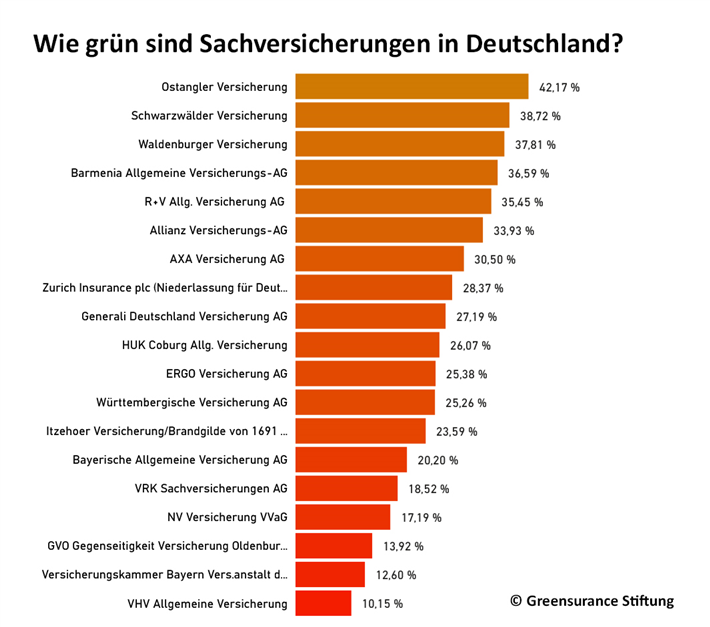 „Beim Vergleich von 19 Sachversicherungen sieht man Pioniere und andere auf einem guten Weg", so Marcus Reichenberg, Geschäftsführer der Greensurance Stiftung, bei der Präsentation der Ergebnisse vor der Versicherungsbranche am Mittwoch, 16. Februar 2022. Das Nachhaltigkeits-Rating hat die Greensurance Stiftung in Zusammenarbeit mit Wissenschaftler:innen des Zentrums für Nachhaltiges Wirtschaften und Management (ZNWM) der Hochschule für Technik Stuttgart (HFT Stuttgart) entwickelt und getestet. Sachversicherungen umfassen unter anderem Haftpflicht, Hausrat und KFZ-Versicherungen.Die Haupt-Ergebnisse des Ratings (siehe Grafik): Die vorderen drei Plätze belegen mittelständisch geprägte „Vorreiter"-Versicherer wie die Ostangler Brandgilde VVaG (Platz 1 mit 42,17%), Schwarzwälder Versicherung VVaG (Platz 2 mit 38,72 %) und Waldenburger Versicherung AG (37,81%). Die größeren Unternehmen wie die Barmenia Allgemeine Versicherungs-AG (36,59), R+V Allg. Versicherung AG (35,45 %) und Allianz Versicherungs-AG (33,93 %) folgen auf Platz 4, 5 und 6. Schlusslicht ist die VHV Allgemeine Versicherung AG auf Platz 19 (10,15%).