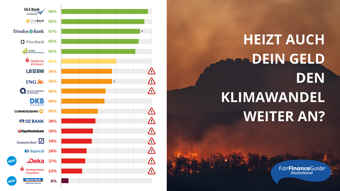 Banken dürfen nicht länger Brandbeschleuniger für Klimawandel und militärische Konflikte bleiben - Fair Finance Guide attestiert nach wie vor Nachhaltigkeitsdefizite im deutschen Bankensektor.
