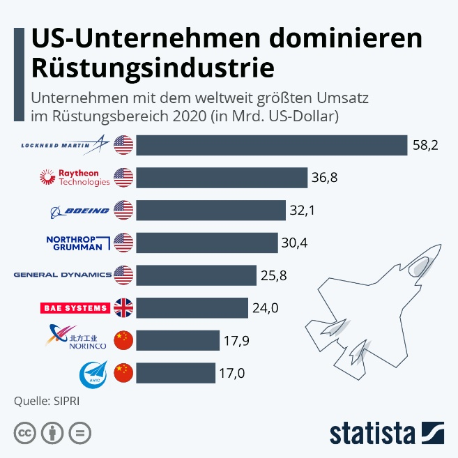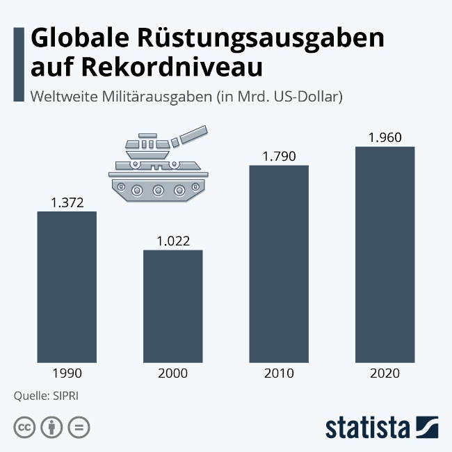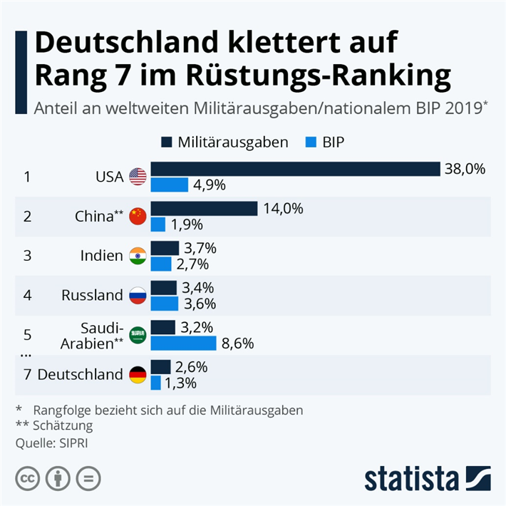 Statista berichtet: „1,9 Billionen US-Dollar wurden laut Angaben des Stockholmer Friedensforschungsinstituts Sipri 2019 für die Bewaffnung und den Unterhalt von Armeen ausgegeben. Zu diesem neuen Rekord trug auch Deutschland schon vor dem Aufrüstungsbeschluss mit einem Ausgabenanstieg von zehn Prozent bei. Insgesamt wurden hierzulande für Rüstungszwecke 49,3 Milliarden US-Dollar ausgegeben - das sind 2,6 Prozent der globalen Militärausgaben beziehungsweise 1,3 Prozent des deutschen Bruttoinlandsprodukts. Aber die Nummer eins des Rüstungs-Rankings sind die USA (38 Prozent/4,9 Prozent) vor China und Indien. Der Musterschüler Deutschland klettert somit vom neunten auf den siebten Platz.