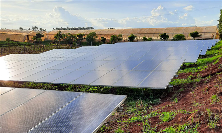 Immer mehr Blumenfarmen in Kenia setzen für ihre Betriebe auf Solarstrom aus eigenen Solaranlagen. So auch Zena Roses, eine Gruppe von drei Fairtrade-zertifizierten Blumenfarmen in Kenia, die Blumen an internationale Kunden in Europa, Australien, dem Mittleren Osten und Russland exportiert und über 1.000 Mitarbeitende beschäftigt. Auf ihrer Farm nahe Eldoret im Westen Kenias werden auf 45 Hektar Rosen, Sprührosen, Chrysanthemen und Schleierkraut gezüchtet. Rund 400 Solarmodule mit einer Leistung von insgesamt 180 kWp versorgen die Farm mit der notwendigen Elektrizität. Die erzeugte Solarenergie ist komplett für den Eigenbedarf gedacht und wird nicht ins Stromnetz eingespeist. In der Nacht oder an bewölkten Tagen, wenn nicht genug Solarenergie produziert wird, bezieht die Farm weiter Strom aus dem Netz. Basierend auf den historischen Verbrauchszahlen kann Zena Roses mit der Anlage durchschnittlich rund 172 Tonnen CO? im Jahr einsparen. Durch die Solaranlage wirkt das Unternehmen nicht nur aktiv dem Klimawandel entgegen, sondern macht sich auch unabhängig von Energiepreisschwankungen. Dadurch sichert die Farm wichtige Arbeitsplätze und stabilisiert die Zukunft der lokalen Community.