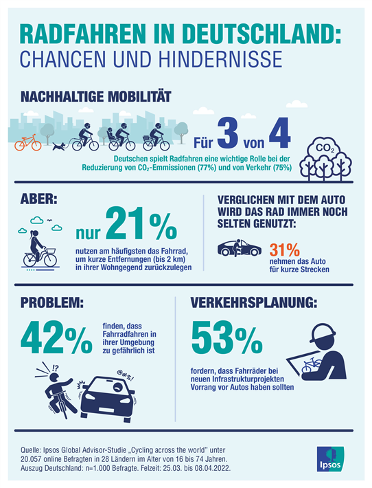 Die Ergebnisse stammen aus der Ipsos Global Advisor-Studie »Cycling across the world«, die anlässlich des Weltfahrradtages am 03. Juni 2022 durchgeführt wurde. Bei der Online-Umfrage wurden zwischen dem 25. März und dem 08. April 2022 20.057 Personen aus 28 Ländern über das Ipsos Online Panel-System interviewt. In Kanada, Malaysia, Südafrika, der Türkei und den USA waren die Befragten zwischen 18 und 74 Jahren alt, in Norwegen zwischen 16 und 99 Jahren und in den restlichen Ländern zwischen 16 und 74 Jahren.