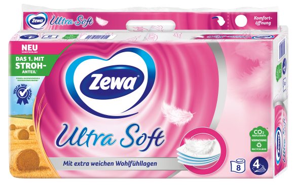 Fast das komplette Sortiment des Zewa-Toilettenpapiers enthält jetzt einen Strohzellstoffanteil von mindestens 10%. Stroh ist ein Restprodukt aus der heimischen Landwirtschaft, das jedes Jahr in großen Mengen ungenutzt bleibt. Essity ist das erste Unternehmen, das Stroh in der industriellen Produktion einsetzt und hochwertige Produkte daraus fertigt. Der Essity-Strohzellstoff ist genauso stark, weich und weiß wie herkömmlicher Zellstoff aus Holz, der CO2-Fußabdruck ist aber um fast ein Drittel kleiner.Dank innovativer Technik: Gewohnter Komfort, verbesserte Ökobilanz