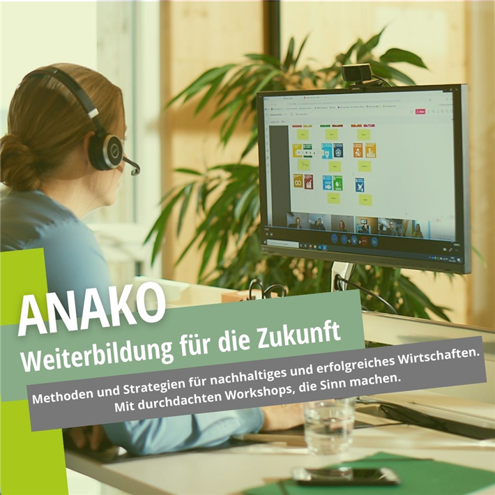 ANAKO steht für Arbeitnehmer*innen mit Nachhaltigen Kompetenzen. Sechs einzelne Module bieten praxisnahe Vermittlung von Methoden und Strategien für nachhaltiges Wirtschaften. Erfahrene Trainer*innen vermitteln Grundlagen, Kenntnisse und Fähigkeiten, damit Arbeitnehmer*innen die Transformation von Grund auf erlernen können. Die Themen der Workshops sind „Einführung in das Thema Nachhaltigkeit", „Prozessmanagement", „Strategie", „Umwelt", „Gesellschaft" und „Ausbildung". Jeder Workshop ist einzeln buchbar, ist aber mit den anderen inhaltlich verbunden. Die Teilnehmer*inne absolvieren die ANAKO-Module als Ein-Tages-Weiterbildung im Online-Format. Zusätzlich sind auch Inhouse-Workshops ab 15 Teilnehmenden möglich.