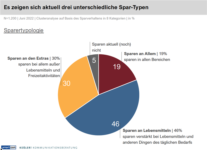 Prof. Dr. Oliver Kaul, Vorsitzender des Academic Board der smartcon GmbH und Mitautor der Studie sieht eine längerfristige Phase der Konsumzurückhaltung und des Downgradings eingeleitet: „95 % der Befragten geben an, dass sie schon jetzt auf die eine oder andere Art sparen. Sie tun dies jedoch sehr unterschiedlich. Wir konnten drei eindeutig voneinander abgrenzbare Sparer-Typen ausmachen: Eine Gruppe spart bei allem, eine Gruppe spart vor allem bei Lebensmitteln und eine Gruppe spart überhaupt nicht bei Lebensmitteln. Die letztgenannte Gruppe macht immerhin 30 % der Bevölkerung aus. Wir sehen also, dass sich völlig unterschiedliche Konzepte herauskristallisieren, wie die VerbraucherInnen mit der aktuellen Situation umgehen."Die Allroundsparer (19 %) sind eher weiblich mit geringerem Einkommen, waren schon vor der Krise preissensibel und sparen bei allen Produkten fast gleich intensiv. Die Lebensmittelsparer (46 %) sparen am meisten bei Lebensmitteln und die Selektivsparer (30 %) haben tendenziell eine höhere Nachhaltigkeitsaffinität und sparen aktuell gar nicht bei Lebensmitteln und kaum bei Freizeitaktivitäten, dafür sehr selektiv bei anderen Produkten wie z. B. Drogerieprodukten oder Bekleidung.