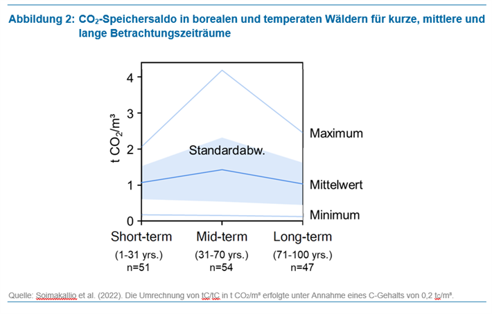 Für boreale und temperierte Wälder konnte ein mittlerer CO2-Speichersaldo von 1,2 t CO2/m³ (Standardabweichung ±0,7 t CO2/m³; alle Betrachtungszeiträume) anhand von 154 Szenarienpaaren aus 45 internationalen Simulationsstudien ermittelt werden (Soimakallio et al. 2022, Abbildung 1-2). Die Ergebnisse sind durch eine deutliche Spannbreite geprägt.