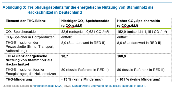 Zum Vergleich: Im Anhang der RED II wird bei der energetischen Nutzung von Stammholz als Hackschnitzel aus dem Wald als Standardwert eine THG-Minderung von über 80 Prozent angenommen (Transportdistanz bis zu 2.500 km; CO2-Speichersaldo bzw. C-Gehalt im Holz nicht berücksichtigt). Mit diesem Standardwert wird der Grenzwert für die THG-Minderung von 80 Prozent eingehalten. Dies ist aber nicht mehr der Fall, wenn die Auswirkung der Holzentnahme auf die Speicherleistung der Waldfläche berücksichtigt wird.