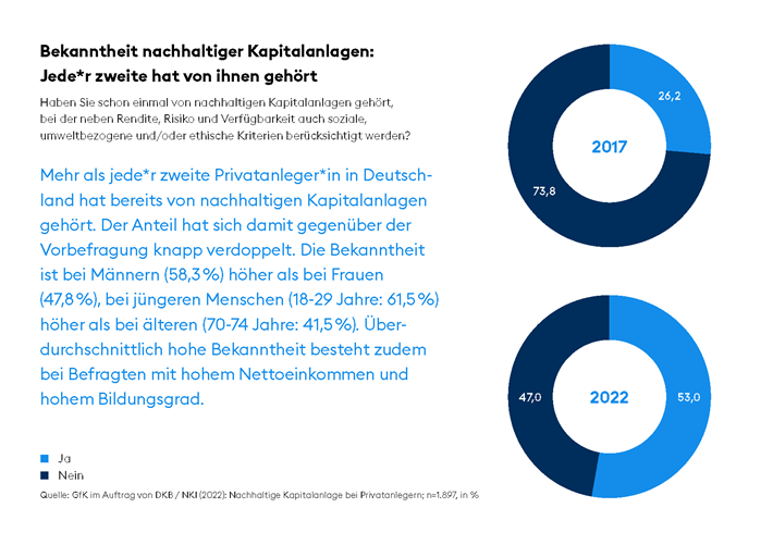 - Bekanntheit: Jede*r zweite Privatanleger*in in Deutschland (53 Prozent) hat bereits von nachhaltigen Kapitalanlagen gehört. Der Anteil hat sich damit gegenüber der Vorbefragung aus dem Jahr 2017 knapp verdoppelt.