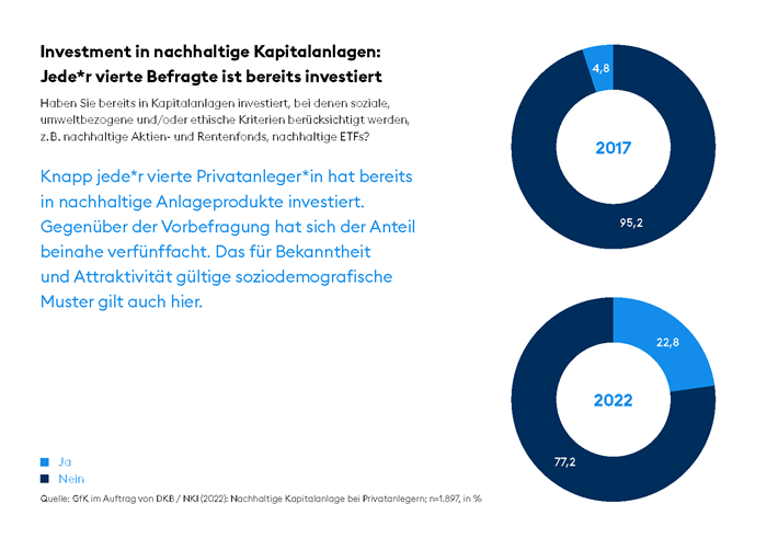- Mehr Anleger*innen: Darüber hinaus hat knapp jede*r vierte Privatanleger*in (22,8 Prozent) bereits in nachhaltige Anlageprodukte investiert. Gegenüber der Vorbefragung hat sich der Anteil beinahe verfünffacht. Bei Befragten mit hohem Sparverhalten bzw. Vermögen liegt der Anteil noch einmal deutlich höher. Die „Lücke" zwischen Attraktivität und Investment hat sich damit im Vergleich zur Vorstudie deutlich verringert: War 2017 nur jede*r achte Befragte, der nachhaltige Kapitalanlage als attraktiv bezeichnete, auch investiert, waren es in der aktuellen Befragung rund 4 von 10 Befragten.