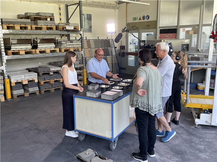 Eine auf Klimaschutz ausgerichtete Unternehmensstrategie, Gewinner des Deutschen Nachhaltigkeitspreises 2018 sowie des Deutschen Rohstoffeffizienz-Preises 2020, der erste mit dem Umweltsiegel „Blauer Engel" gekennzeichnete Betonstein 2021 und eine Philosophie, die auf Generationen und weniger auf Quartale ausgerichtet ist – der Hersteller Rinn zählt zu den Nachhaltigkeits-Pionieren in der Baustoffindustrie. Jetzt geht das Heuchelheimer Unternehmen noch einen Schritt weiter und präsentiert einen nahezu zementfreien Betonstein, was eine absolute Innovation am Markt darstellt. Sowohl Nachhaltigkeitsstrategie als auch der neue "Klimastein" haben daher auch das Interesse des Wirtschaftsmagazins Plusminus geweckt und waren Thema eines Beitrages, der am 3.8. in der ARD ausgestrahlt wurde. Vor dem Hintergrund, dass in der Zementherstellung immer noch viel CO2 produziert wird, hat sich das Familienunternehmen mit Alternativen beschäftigt. Das Ergebnis ist ein Betonstein, der mit 90 % weniger Zement auskommt. Gelungen ist das über einen zementfreien Trägerbeton, der den Hauptteil des Steins ausmacht. Lediglich die Designschicht, der sogenannte Vorsatzbeton, besitzt nach wie vor einen Zementanteil, um eine gleichbleibende Optik und Haptik zu garantieren. Im nächsten Schritt soll aber auch hier ohne Zement gearbeitet werden. Rinn ist so ein weiterer Durchbruch in Sachen CO2-Reduktion und klimaschonender Außengestaltung gelungen.
