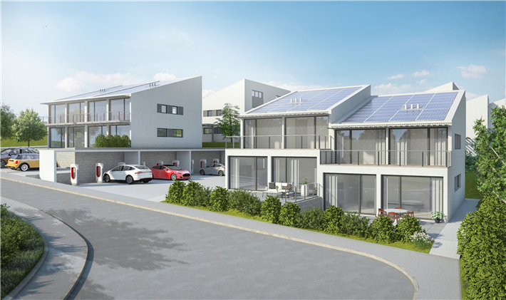 Geothermie aus einer Tiefenbohrung speist die Wärmeversorgung und Kühlung. Der Strom wird über Photovoltaik auf den Dächern erzeugt. Die Bewohner können ihren Stromverbrauch nicht nur kontrollieren, sondern via App auch steuern. Der Energieüberschuss kann in einer zentralen Batterie zwischengespeichert werden und steht allen Mieterinnen und Mietern im Quartier zum Laden der integrierten Carsharing E-Flotte zur Verfügung. Insgesamt können die Bewohner im Quartier drei E-Fahrzeuge und zehn E-Bikes sowie zwei Lastenräder nutzen. Für Gewobau-Geschäftsführer Karl-Heinz Seeger ein wichtiger Aspekt: ,,Mobilität dient damit nicht länger der Status-Symbolik, sondern wird Teil eines Sharing-Gedankens, der die Gemeinschaft und das Miteinander im Sinne einer guten Nachbarschaft fördert."