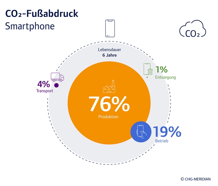 Doch auch wenn IT-Geräte nach der Erstnutzung nur ein einziges Mail wiederaufbereitet bzw. refurbished und weitervermarktet werden, ist der Effekt bereits deutlich: Durch die Verlängerung der Nutzungsdauer lassen sich in der Gesamtbetrachtung mehr als ein Drittel an CO2-Emissionen einsparen. Der Grund: Bei DaaS oder Leasing werden die IT-Geräte nach der Erstnutzung in der Regel vom Vermieter bzw. Leasinggeber zurückgenommen, wiederaufbereitet und erneut auf den Markt gebracht. Dadurch müssen in Summe weniger Geräte neu hergestellt werden. Dabei ist wichtig zu wissen, dass bei IT-Geräten ein Großteil der CO2-Emissionen im Rahmen der Produktion entstehen. Die Green IT-Studie zeigt auf, dass 76 Prozent des CO2-Footprints eines Smartphones auf den Herstellungsprozess entfallen.