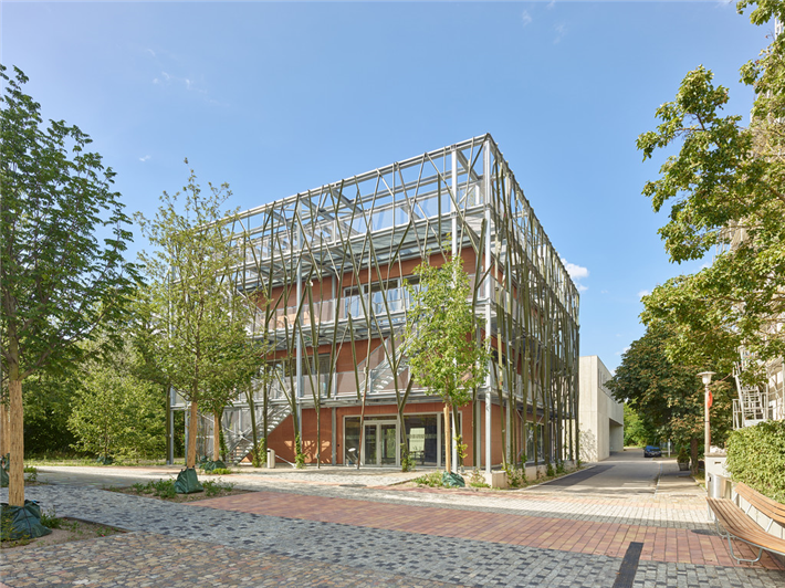 Eine zentrale Rolle spielen die 60 Jahre alten Hochspannungs-Gittermasten, die als Schrottmaterial dem Netzbetreiber Swissgrid abgekauft wurden. Anstatt eingeschmolzen zu werden, ummanteln sie jetzt die Laubengänge, die eine ebenfalls stählerne Gitterstruktur rund um den hölzernen Kubus bilden. Ursprünglich sollten die gebrauchten Masten tragend eingesetzt werden, doch da die außenliegenden Gänge auch als Fluchtweg dienen, ließen die Baubestimmungen dies nicht zu. So bilden die ehemaligen Strommasten jetzt ein Rankgerüst für Kletterpflanzen, was wiederum der Verschattung und damit dem (Raum-)Klima dient. Zudem sind die Laubengänge eine nicht zu beheizende Erschließungszone, sodass das Innenvolumen reduziert werden kann. Innen kehrt das Masten-Motiv an den Brüstungen wieder.