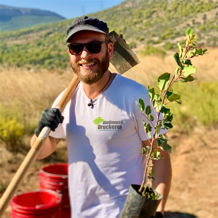 In Kooperation mit der Nonprofit-Organisation We4all möchte dieUmweltDruckerei daher zumindest einen kleinen Teil in Ostattika wieder aufforsten. Wichtig ist es natürlich, dass ausschließlich heimische Bäume, Pflanzen und Büsche gepflanzt werden. Vor Ort haben Kevin Riemer-Schadendorf und Anastasia Zeller insgesamt 400 Zypressen, Johannisbrot- und Judasbäume sowie Lorbeersträucher gepflanzt.