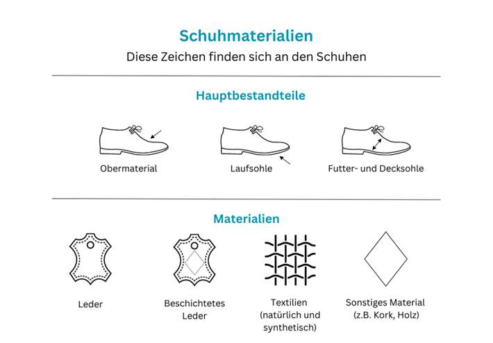 Obermaterial, Sohle, Innenfutter und Innensohle bestehen aus unterschiedlichen Materialien. Bei den klassischen Schuhmodellen kommt oft Leder zum Einsatz. Deutlich günstiger sind Kunstlederschuhe und die pflegeleichten Textilschuhe.