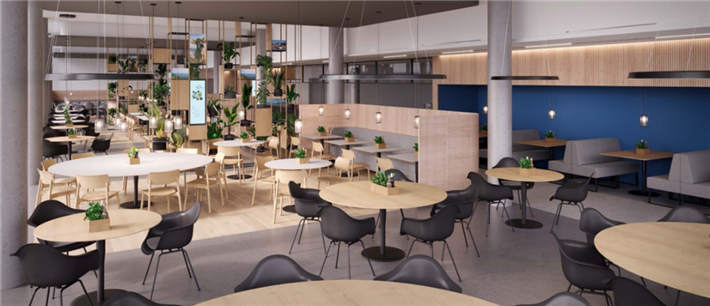 Als Herzstück und kommunikativer Mittelpunkt entsteht im Erdgeschoss das neue Betriebsrestaurant des Standortes, dass sich fließend zur großzügigen Terrasse hin in den Außenbereich öffnet. So entwickelt sich im Gebäude eine Vielzahl von Kommunikations- und Allgemeinflächen, die eine moderne interaktive Arbeitswelt der Zukunft bietet.